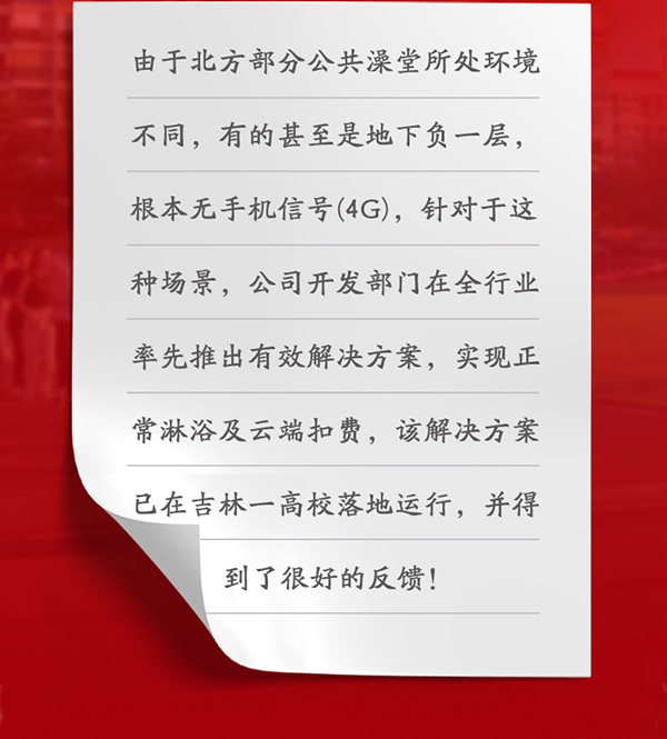 由于北方部分公共澡堂所處環(huán)境不同,有的甚至是地下負(fù)一層,根本無手機(jī)信號(4G),針對于這種場景,公司開發(fā)部門在全行業(yè)率先推出有效解決方案,實(shí)現(xiàn)正常淋浴及云端扣費(fèi),該解決方案已在吉林一高校落地運(yùn)行,并得到了很好的反饋!